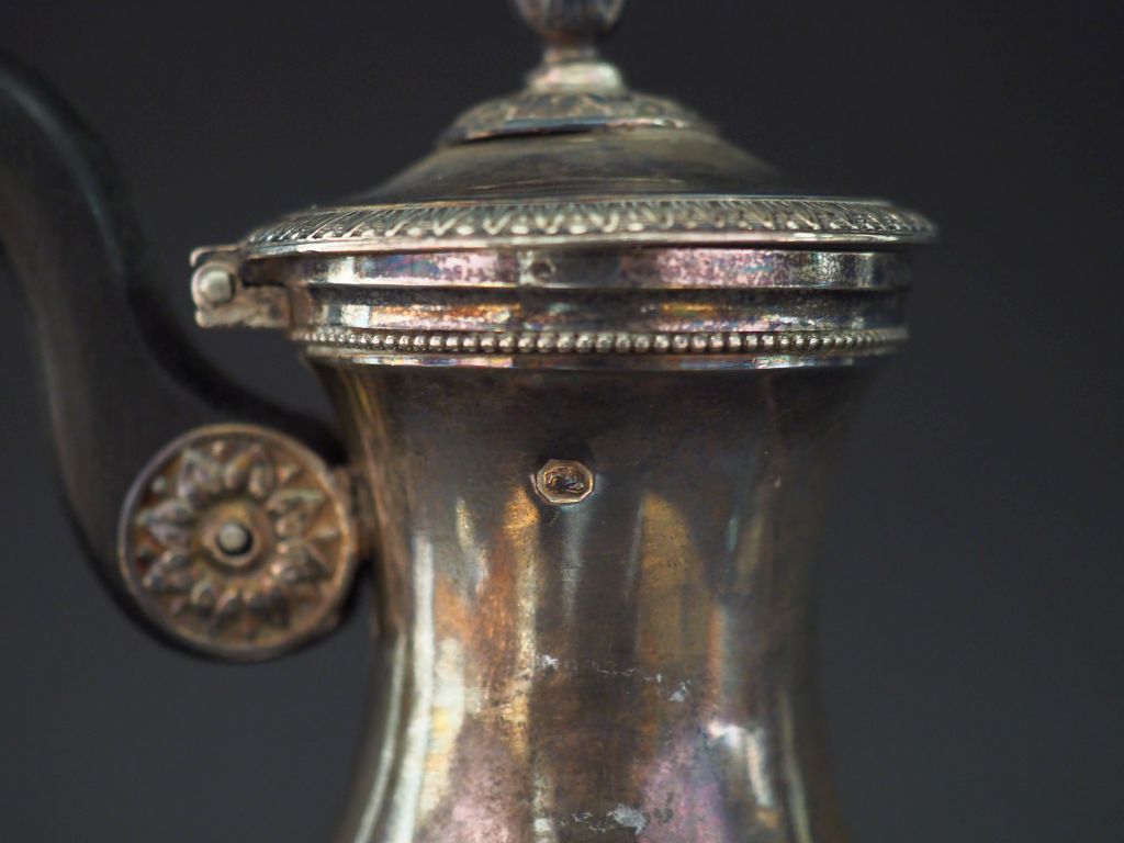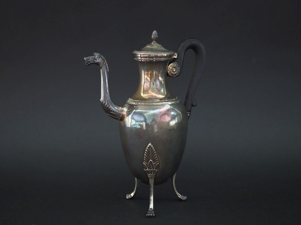 Petite verseuse fin XVIIIème - début XIXème en argent, poinçon au Coq, à décor de frises de feuille d'eau. Reposant sur trois pieds griffes, attaches à décor de palmettes. Bec verseur en forme de cheval. Anse en bois noirci. Prise du couvercle en forme de pigne de pin. H. 22,5 cm Poids tel. 400 g