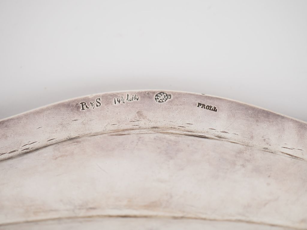 Plat ovale en argent de style Louis XV, poinçon cygne, modèle à filets. Bord chantourné. Armorié. M.O : Proll 30 x 44 cm Poids. 1302 g