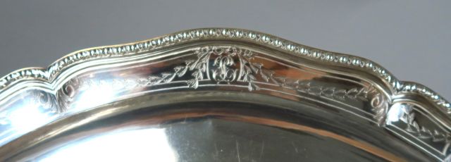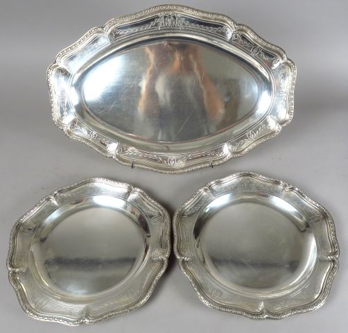 Plat ovale et paire de plats ronds en argent, poinçon Minerve, à décor de frises d'ogives, et de guirlandes de feuillage. Monogrammés dans des cartouches. G. BACHELET à Paris. Diamètre : 33 cm. Longueur du plat ovale : 52 cm. Poids de l'ensemble : 4 166 g