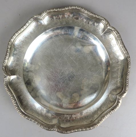 Plat rond en argent à décor de palmettes, monogrammé dans un cartouche. Bordure chantournée à décor d'ogives. Diamètre : 25 cm. Poids : 573 g Poinçons du XVIIIIe