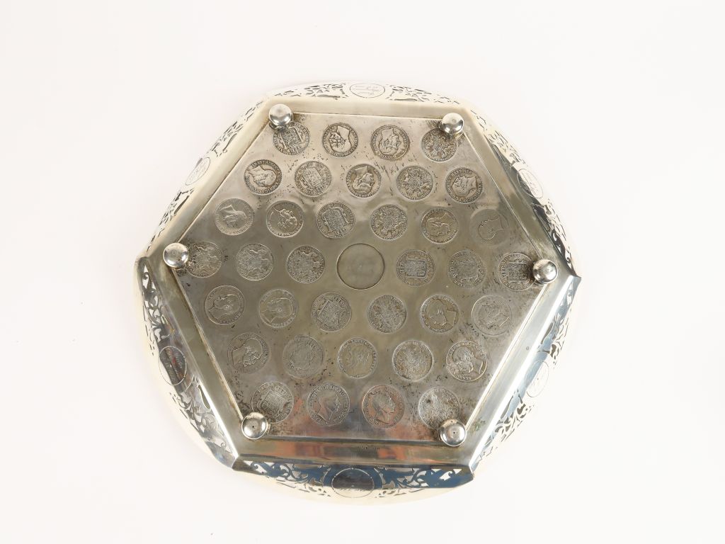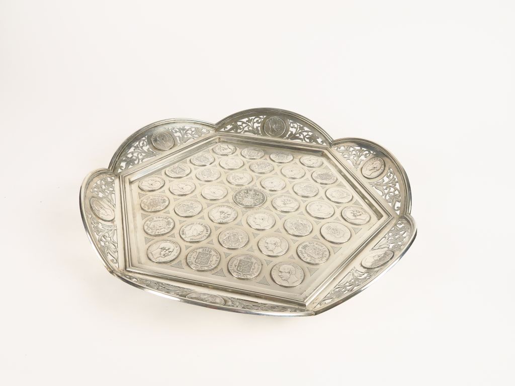 Plateau en argent à bords polylobés et ajourés, l'ensemble orné de 42 pièces d'argent. Poids : 2 150 g