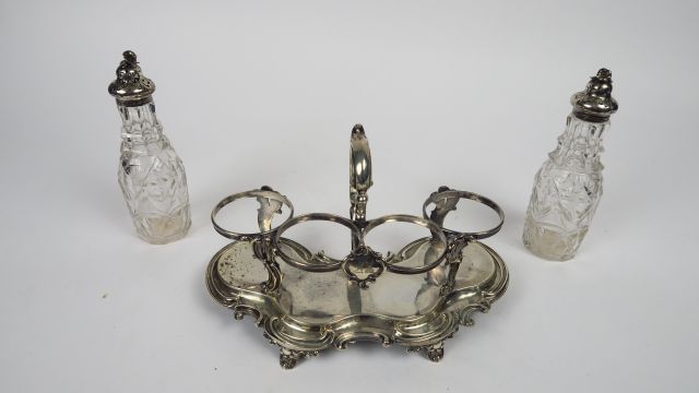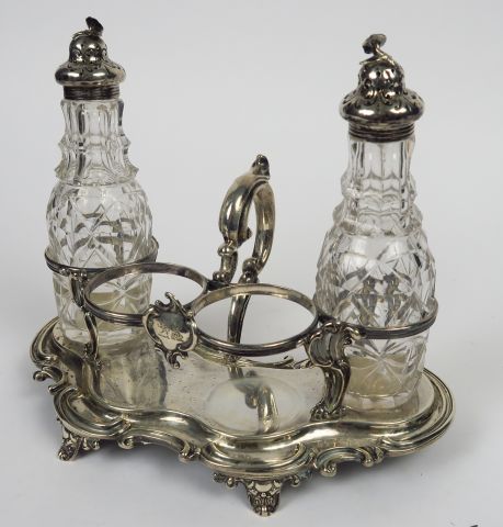 Porte condiments anglais de style Rocaille en argent, deux flacons en cristal, bouchons en argent à décor de fleurs (manque deux flacons). Poids : 500 gr