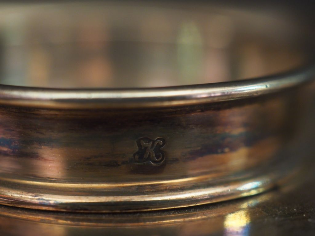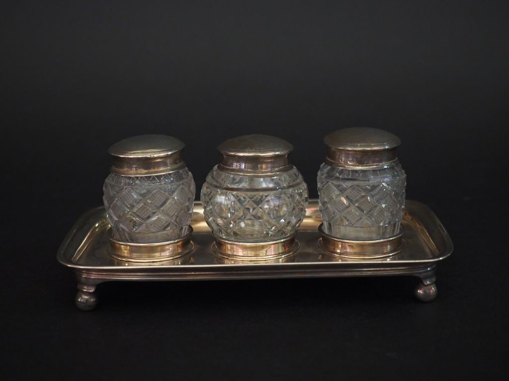 Porte-condiments de forme quandrangulaire en argent étranger et verre taillé. Reposant sur quatre petits pieds boules. Poids tel. 500 g (un petit récipient accidenté, l'un probablement rapporté)