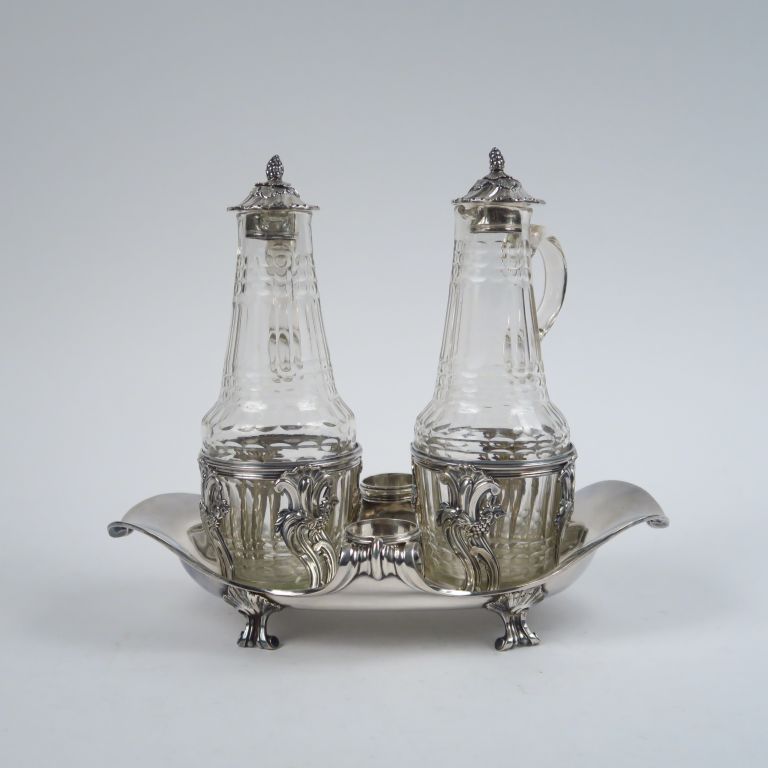 Porte huilier-vinaigrier Louis XV en argent. Avec ses flacons. M.O : JBC Paris. Poids. 720 g