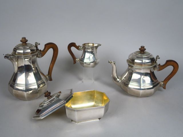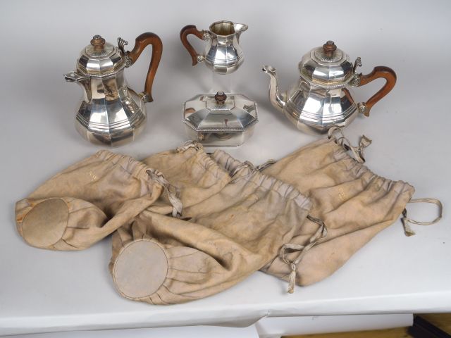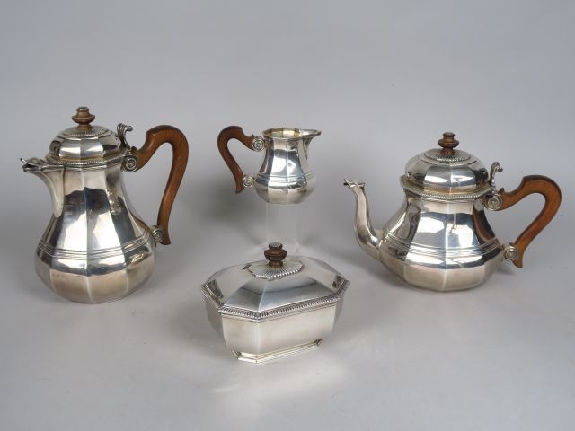 PUIFORCAT. Service à thé et à café en argent, poinçon Minerve, comprenant quatre pièces de forme. Prises en palissandre. L'intérieur du sucrier en vermeil. Poids tel : 2625 g. On y joint leurs housses d'origine