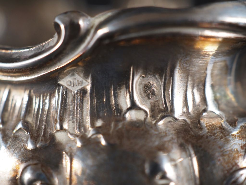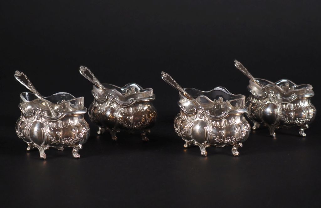Quatre salerons ovales de style Louis XV sur quatre patins avec leur pelle argent poinçon Minerve (verrines blanches). Poids : 120 g