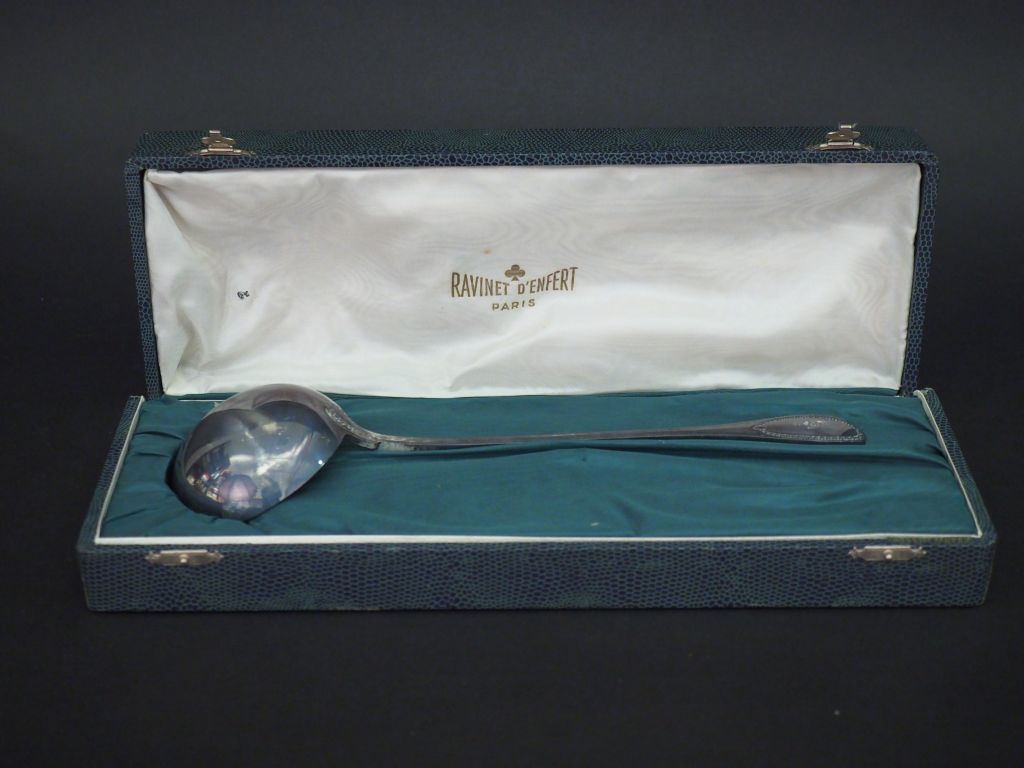 RAVINET D'ENFERT à Paris. Louche de style Louis XVI en argent, poinçon Minerve, à décor de perles. Dans son écrin. Poids. 236 g