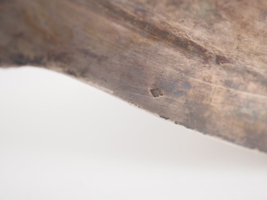 Ravissante saucière de style Louis XV en argent 925, poinçon Minerve, à décor de rinceaux, rocailles, enroulements et motifs peignés. Attaches des anses feuillagées. Monogrammée sur le plateau. M.O : H Cie 11,5 x 25,5 x 17 cm Poids. 747 g