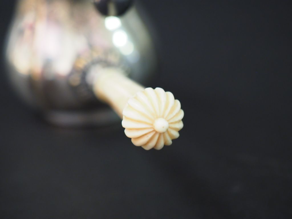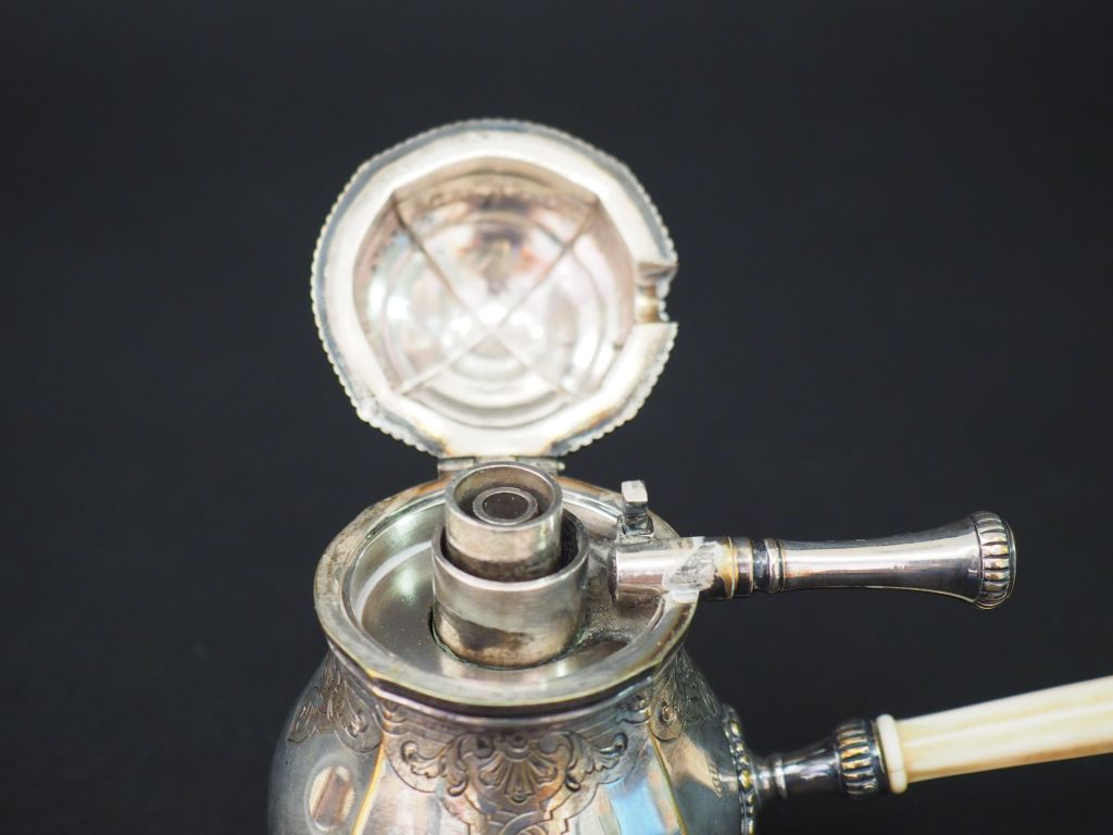 Réchaud de style Louis XIV en métal argenté, manche en ivoire tourné.