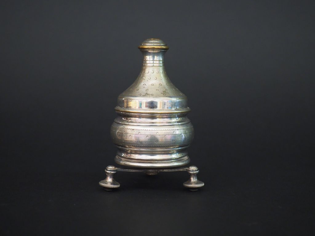 Saleron de style Louis XVI en métal argenté, piètement tripode.
