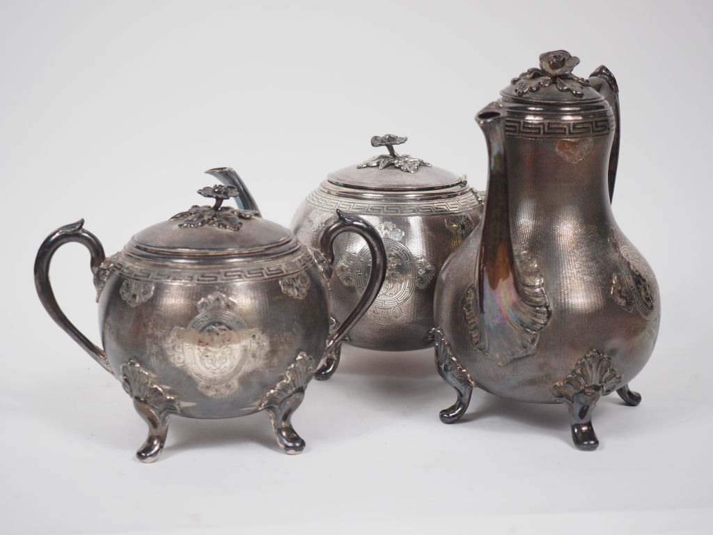 Service à café Napoléon III en argent, poinçon Minerve, à décor de cartouche feuillagé et monogrammé, de rocailles et de grecques, prise des couvercles en forme de fleurs. Poids total : 2035 g
