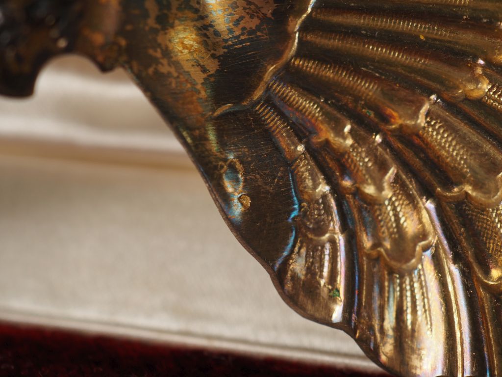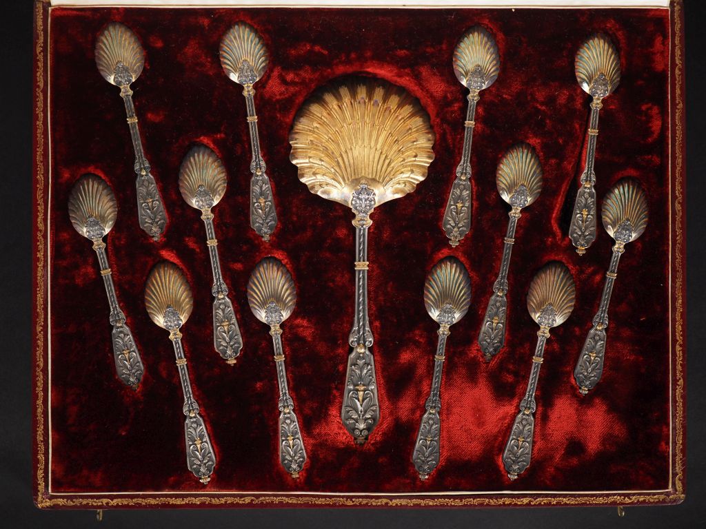 Service à fraise en en argent et argent doré, poinçon tête de sanglier, à décor de rinceaux et feuillage. Comprenant : - une cuillère à servir - douze petites cuillères. Ravissants cuillerons en forme de coquille. M.O : E. PUIFORCAT Poids. 279 g Dans son coffret.