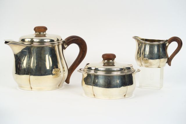 Service à thé et à café 3 pièces de style Art Déco en argent, poinçon Minerve. MO : Fouquet Lapar, plateau en métal argenté 1204 g tel