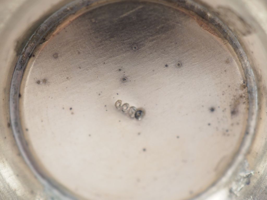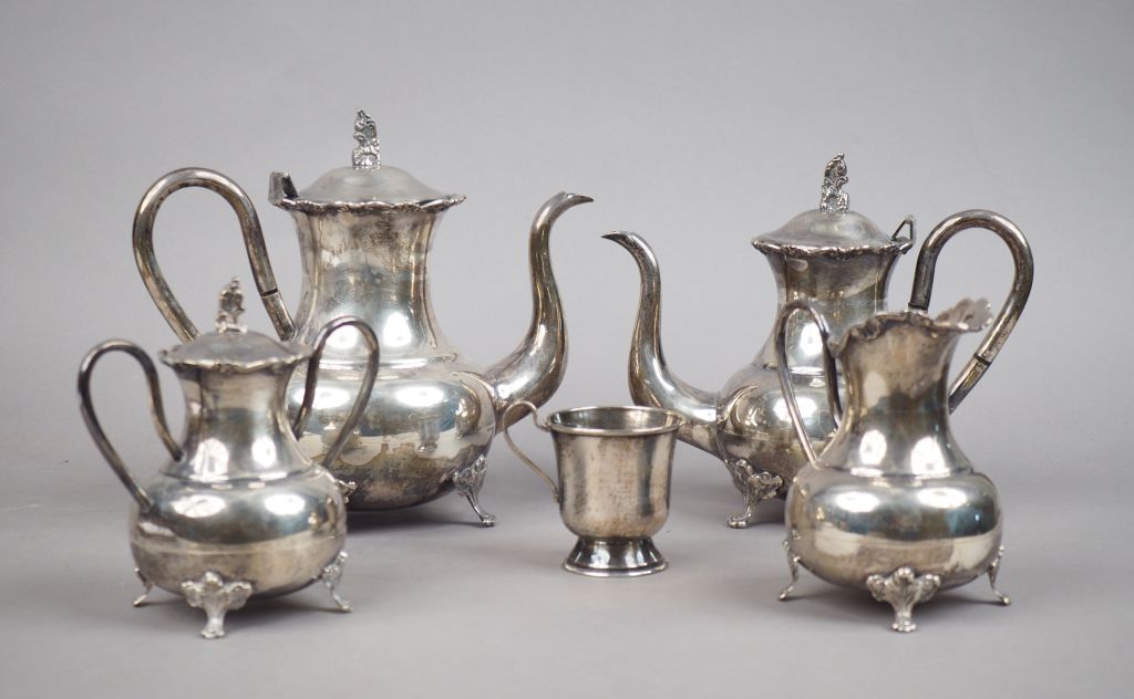 Service à thé et à café quatre pièces en argent étranger 900 millièmes. Comprenant : - une cafetière - une théière - un sucrier - un pot à lait Poids. 1582 g On y joint une petite tasse à anse en argent étranger 900 millièmes. Poids. 67 g