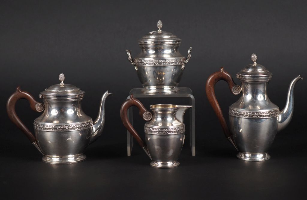 Service égoiste quatre pièces de style Louis XVI en argent, poinçon Minerve, manches en acajou Poids sucrier : 166 g poids cafetière : 195 g tel poids théière : 200 g tel poit à lait : 87 g tel