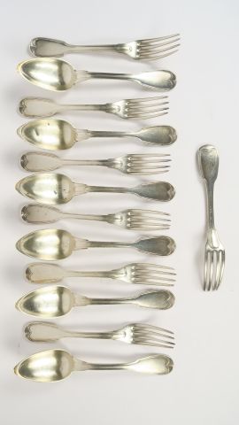 Six grands couverts en argent, modèle au filet, monogrammés, poinçon Vieillard, on y joint une fourchette en argent, modèle au filet monogrammée dans un cartouche. 1174 g