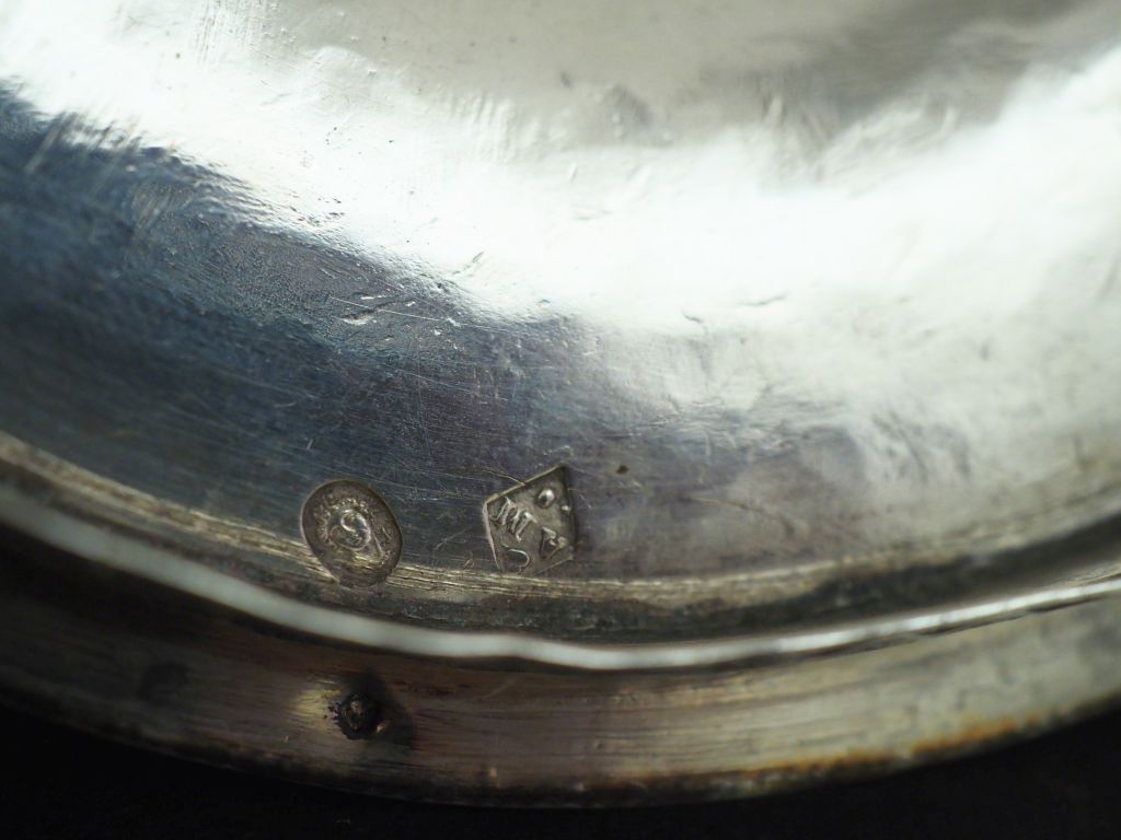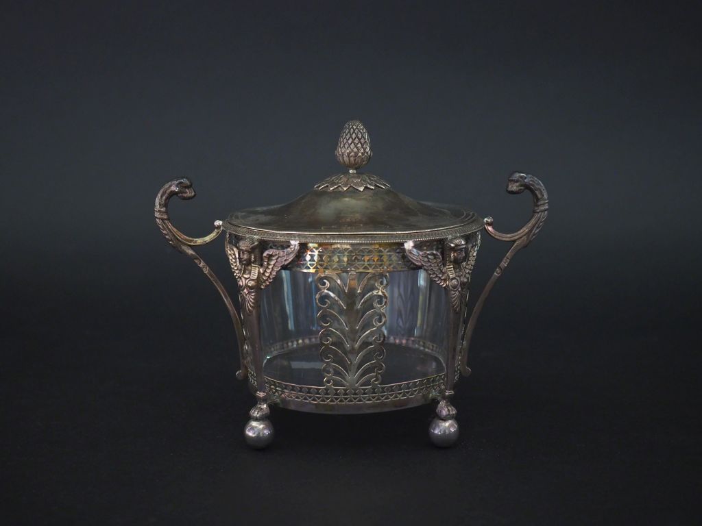 Sucrier à anses fin XVIIIème - début XIXème en argent 950, poinçon au 1er Coq, à décor de divinités égyptiennes ailées en gaine et feuillage ajouré. Reposant sur quatre pieds boules, anses en forme d'animal, prise en forme de pigne. Avec sa verrine. H. 15 cm Long. 18,5 cm Diam. 12,5 cm Poids. sans la verrine : 366 g