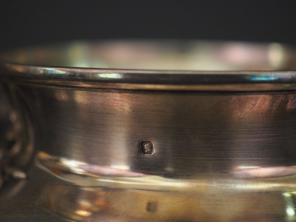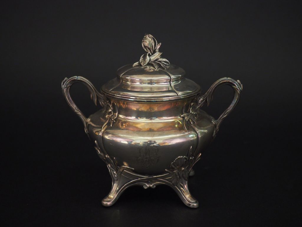 Sucrier de style Art Nouveau en argent, poinçon Minerve, à décor d'iris. Anses feuillagées. Prise du couvercle en forme de fleur. M.O : R.D Monogrammé. H. 16,5 cm Poids. 407 g