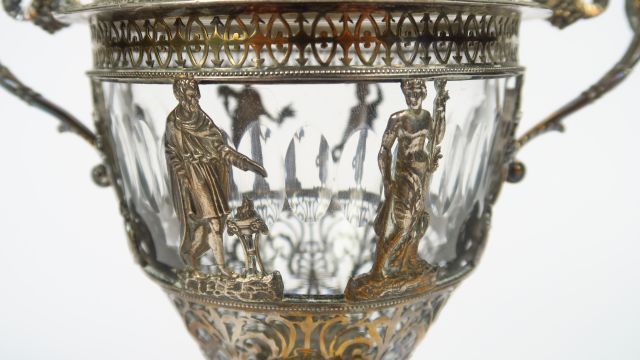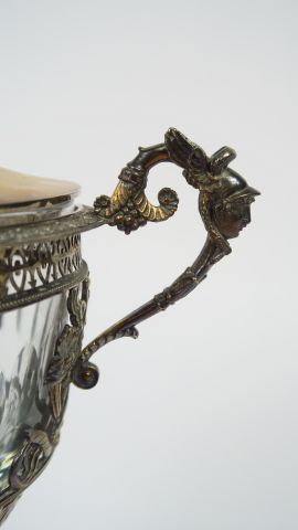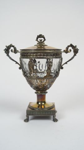 Sucrier fin XVIII ème en argent, poinçon au premier coq, et cristal, à décor de personnages à l’antique, les anses ornées d’une tête de Minerve. Poids tel : 800 gr