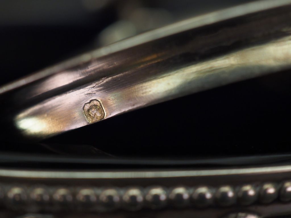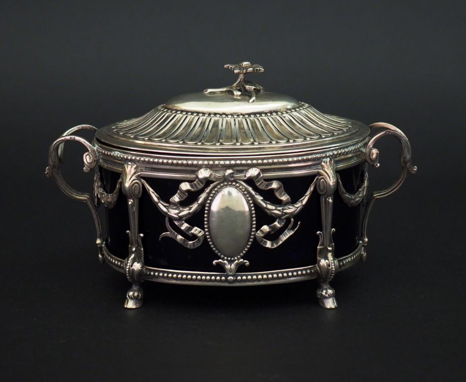 Sucrier Napoléon III de style Louis XVI en argent, poinçon Minerve, à décor ajouré de nœuds de ruban, cartouches, feuille d'acanthe, rinceaux et rangs de perles. Reposant sur quatre petits pieds terminés en sabot de biche. Anses feuillagées. Couvercle, à décor de cannelures et prise en forme de fleur épanouie. Avec sa verrine bleue. 11,5 x 17,5 x 9,5 cm Poids. 247 g