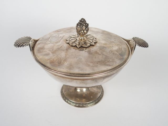 Sucrier sur piédouche en argent, poinçon au premier coq, anses en forme de coquilles, prise en forme de fruit, couvercle monogrammé. MO : JBD. H. : 15,5 cm. Poids : 667 g