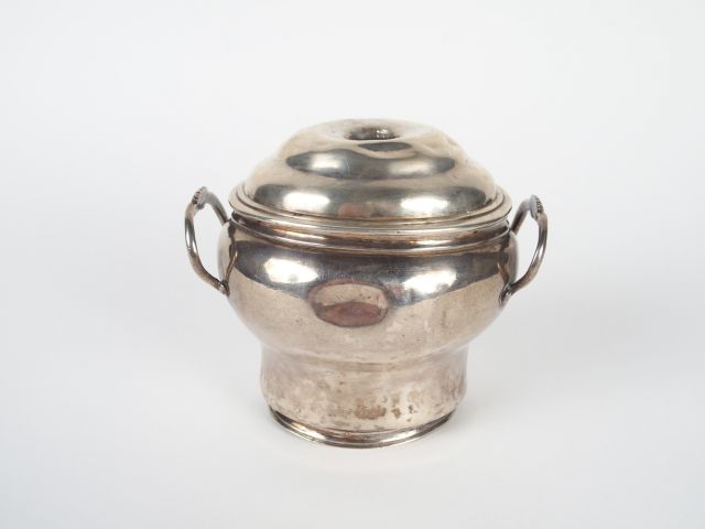 Sucrier XVIIIe en argent, anses à décor de coquille. M.O : IB. Poids : 365 g (manque la prise, enfoncements)