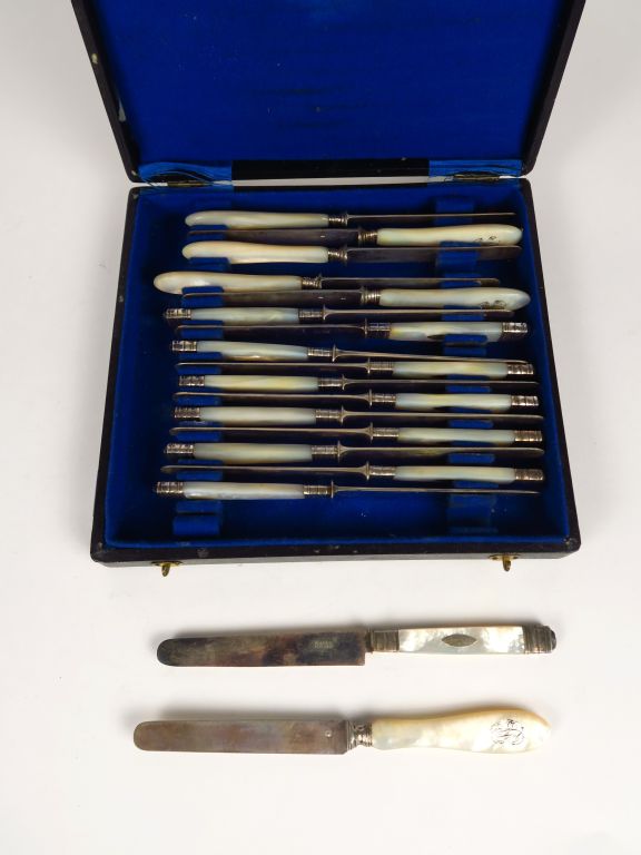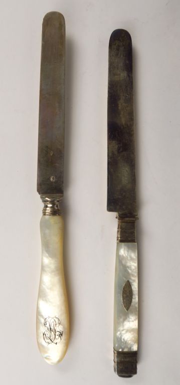 Suite de 12 couteaux à fromage, manches en nacre, lame acier. On y joint une suite de 6 couteaux lame en argent, manches en nacre monogrammée