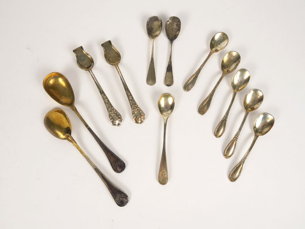 Suite de 5 cuillères à sel en argent, poinçon Minerve. On y joint 5 autres cuillères à sel, et deux cuillères en argent et vermeil. Poids : 87 g