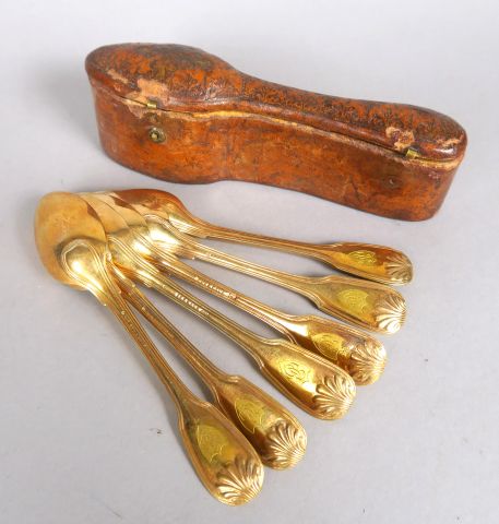 Suite de 6 cuillères en vermeil, monogrammées, dans un étui en cuir XVIIIe (petits manques). Poids des cuillères : 203 g