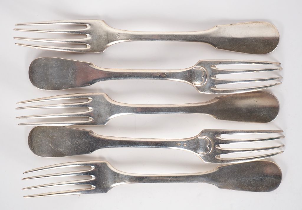 Suite de cinq grandes fourchettes en argent 925, poinçon Minerve, modèle uniplat. M.O : A.F Poids. 463 g
