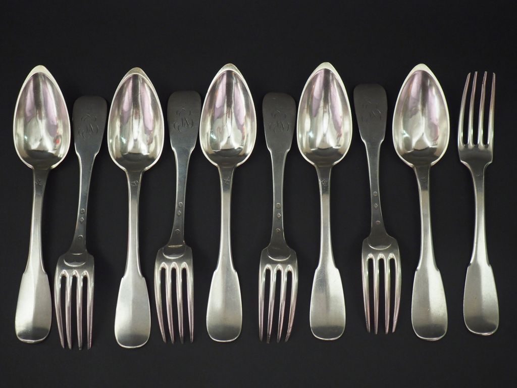 Suite de cinq grands couverts Restauration en argent, poinçon Vieillard, modèle uniplat. Monogrammés. Poids. 827 g
