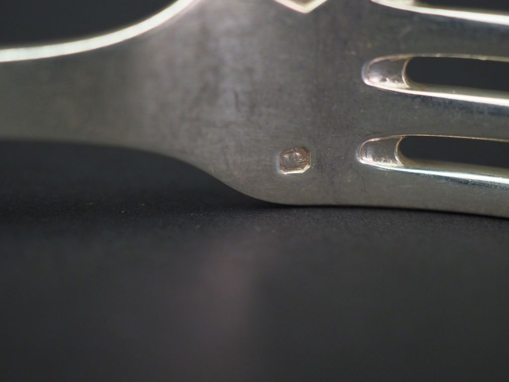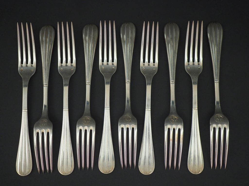 Suite de dix grandes fourchettes de style Art déco en argent, poinçon Minerve. Le revers de la spatule godronné. Monogrammées. M.O : A.C ou A.G Poids. 902 g