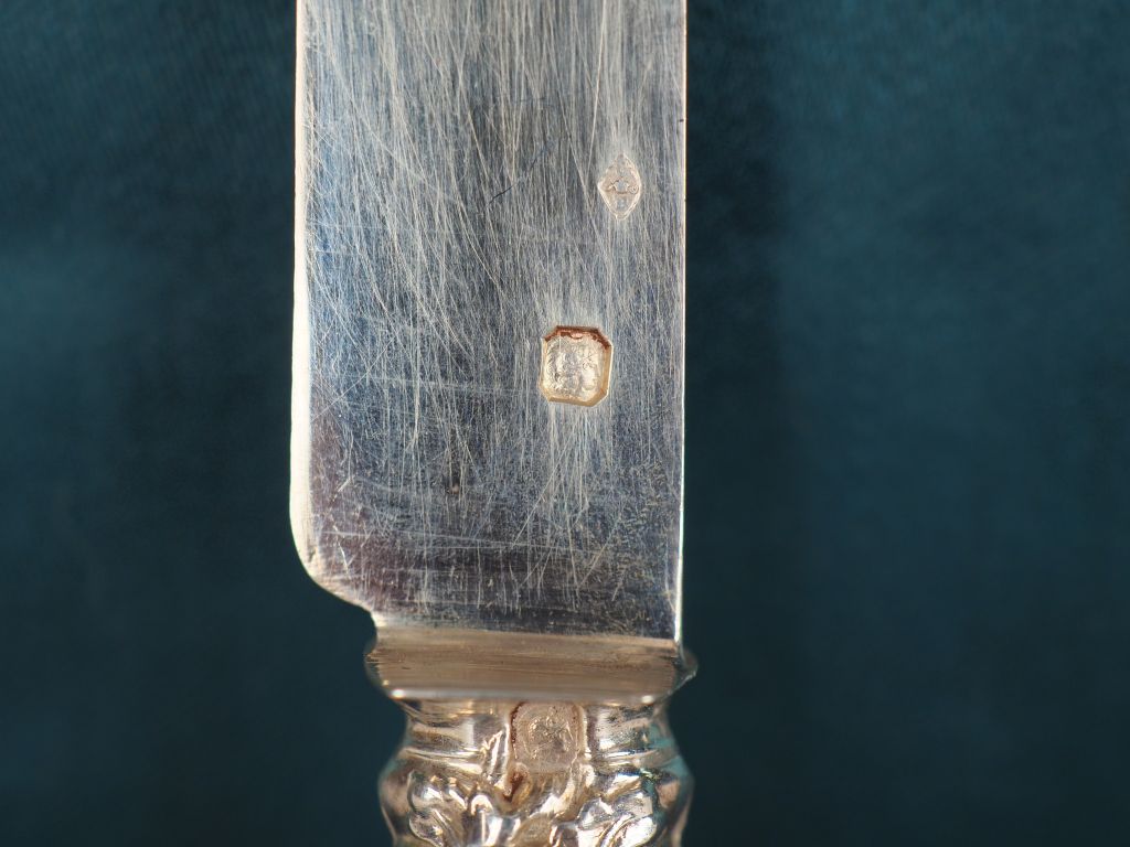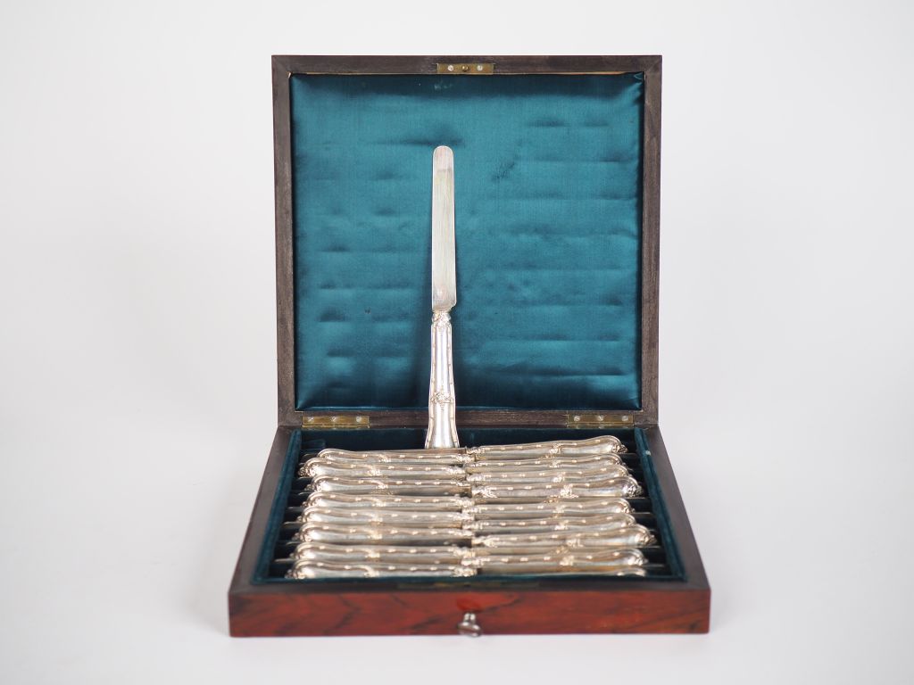 Suite de dix-huit couteaux à fruits, à décor de grappes de raisins. Lames argent, poinçon Minerve. Manches argent fourré. Poids tel. 598 g Dans leur boite en acajou fileté de laiton.