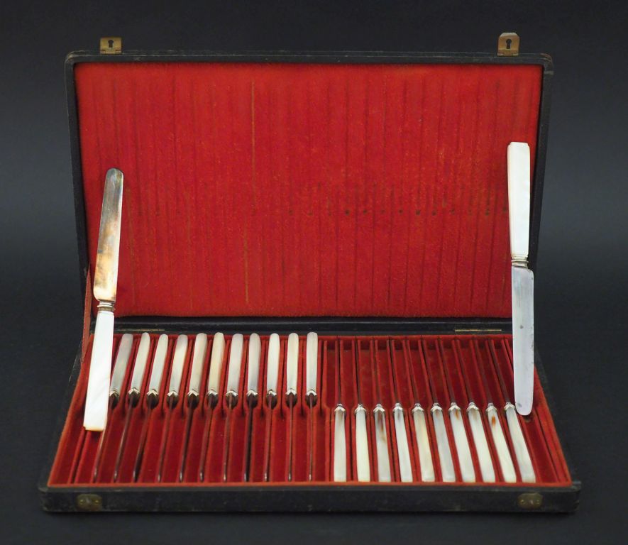 Suite de douze couteaux à fromage Restauration, lame argent, poinçon Vieillard, manche en nacre. Poids tel. 435 g On y joint une suite de onze petits couteaux du même modèle, lame en métal, manche en nacre. Dans un coffret.