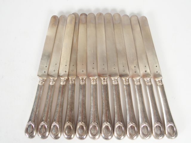 Suite de douze couteaux à fruit, lame argent, manche argent fourré, à décor de cartouche. Poids tel : 504 g