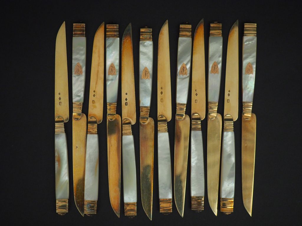 Suite de douze couteaux à fruit Restauration lame en vermeil, poinçon Vieillard. Manches en nacre, à décor d'un blason monogrammé. Poids tel. 435 g