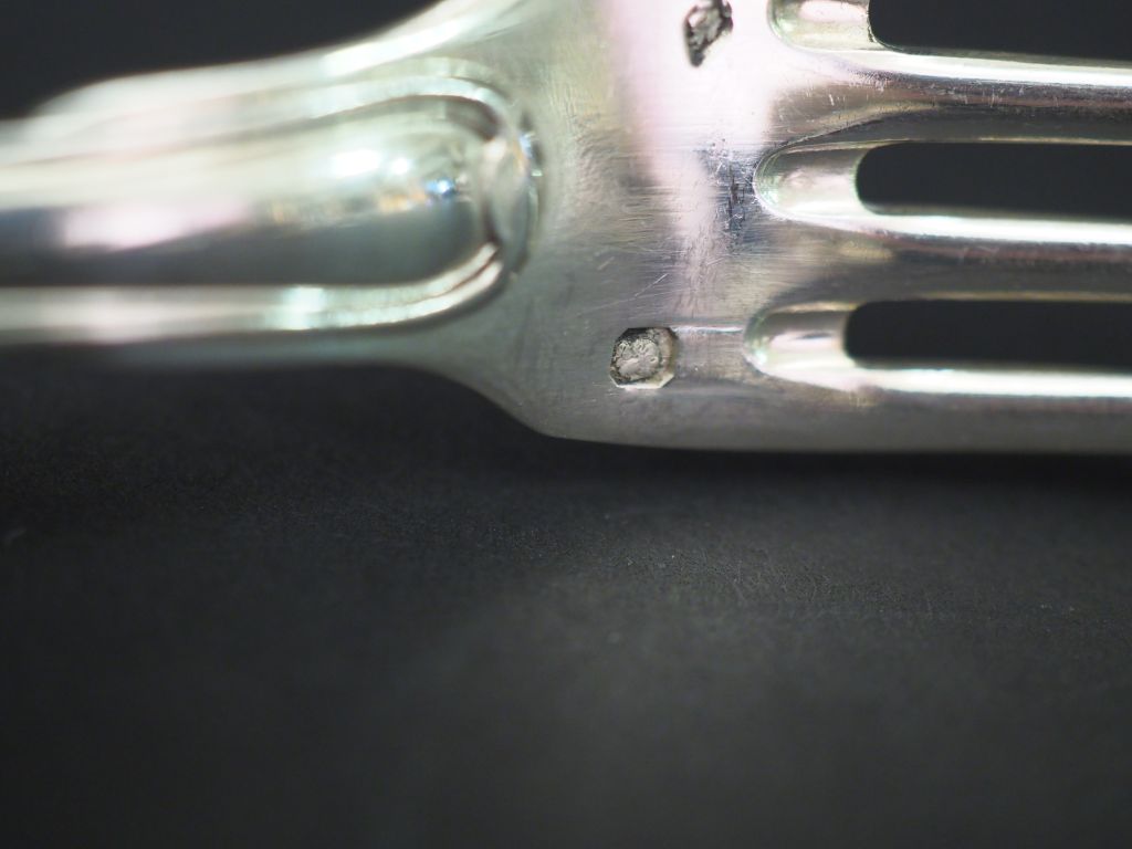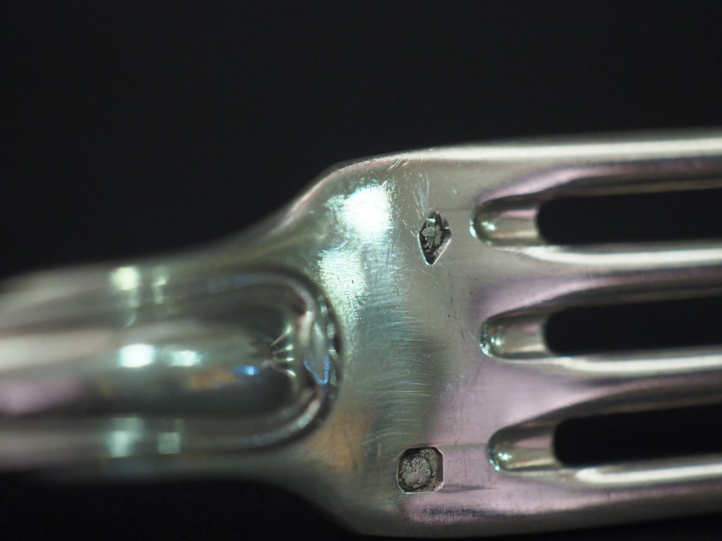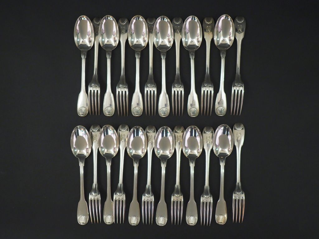 Suite de douze couverts à entremets en argent, poinçon Minerve, modèle à double coquilles. Monogrammés. Poids. 1212 g