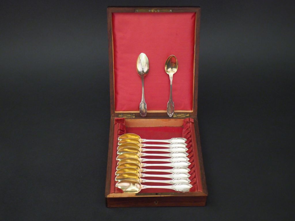 Suite de douze cuillères à café en argent et vermeil, poinçon Minerve, à décor de coquilles, rinceaux et fleurons. M.O : P.D Poids. 225 g (manque la pince à sucre) Dans leur coffret an cajou et marqueterie, marqué "Café"