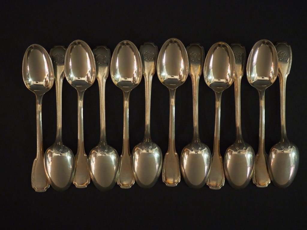 Suite de douze cuillères à café en argent, poinçon Minerve, à décor de monogramme. Poids. 339 g