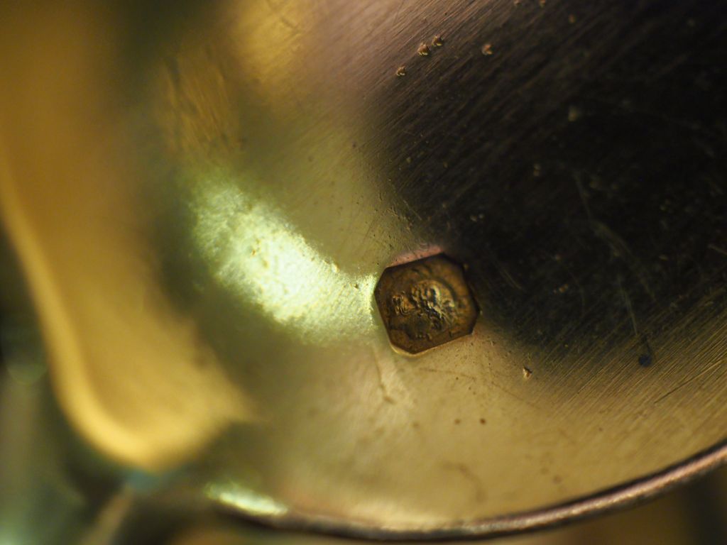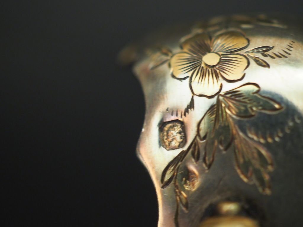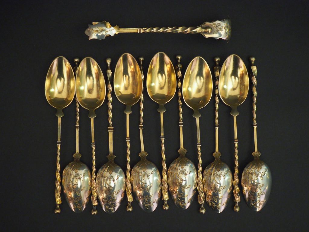 Suite de douze cuillères à thé et une pince à sucre en vermeil, poinçon Minerve, à décor de branchages fleuris. Manches torsadés. M.O : Chevron Fils Poids. 231 g