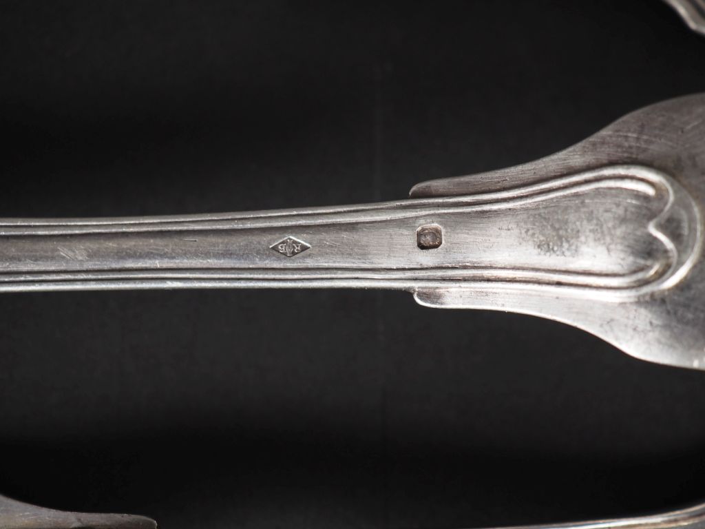 Suite de douze grands couverts en argent 925, poinçon Minerve, modèle à filt. Monogrammés. M.O : R.B Poids. 2230 g