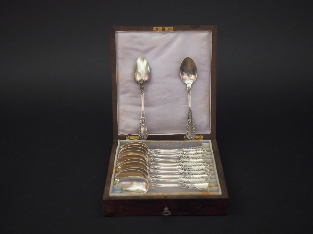 Suite de douze petites cuillères en argent, poinçon Minerve, modèle feuillagé. Monogrammées. M.O : H.G Poids. 290 g Dans leur écrin en acajou gainé de laiton.