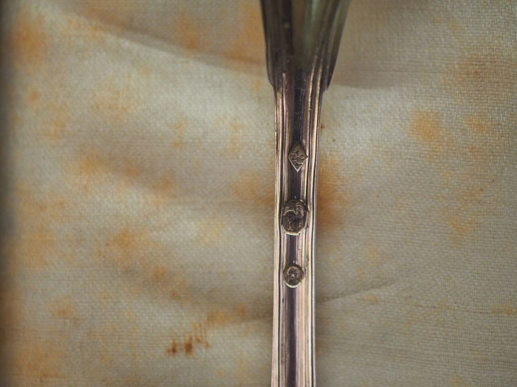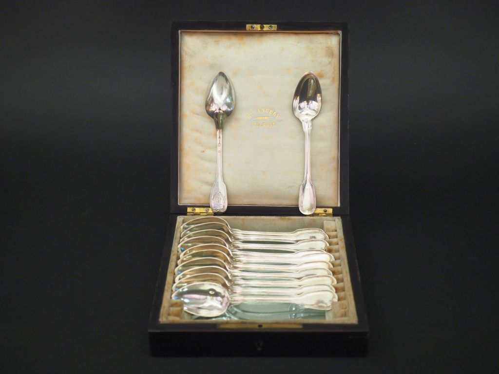 Suite de douze petites cuillères fin XVIIIème - début XIXème en argent, poinçon au Coq, modèle à filet et cartouche monogrammé. M.O : B.C Poids. 256 g Dans un écrin à fond de glace en bois noirci gainé de laiton.