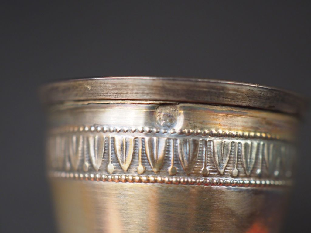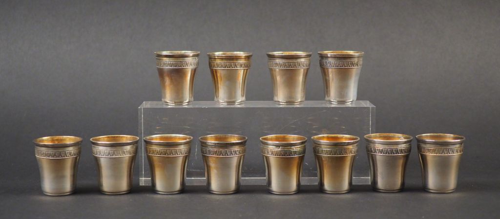 Suite de douze verres à liqueur de style Louis XVI en argent, poinçon Minerve, à décor de frise de feuilles d'eau. Poids. 111 g