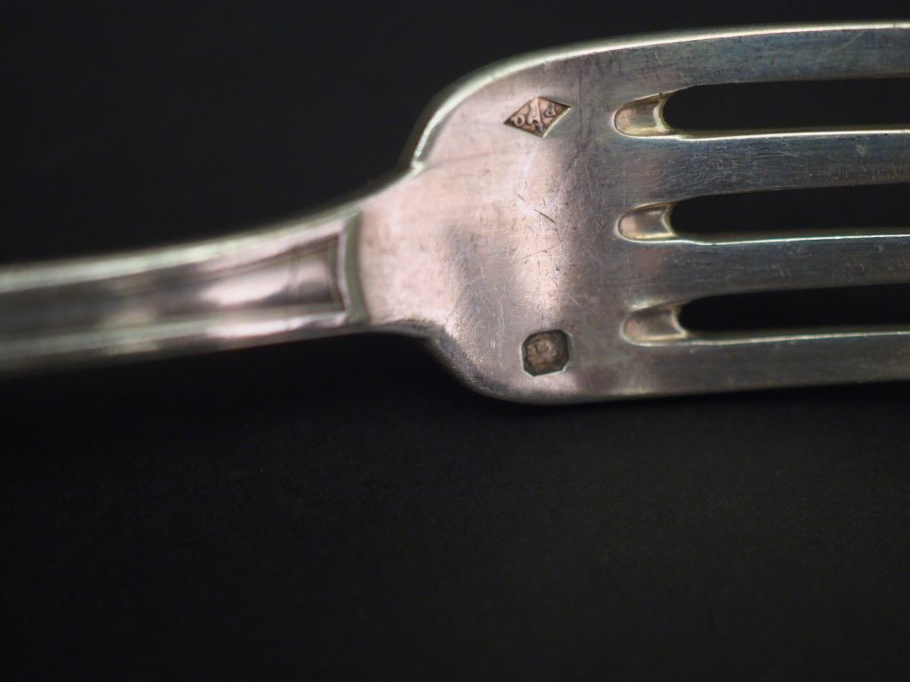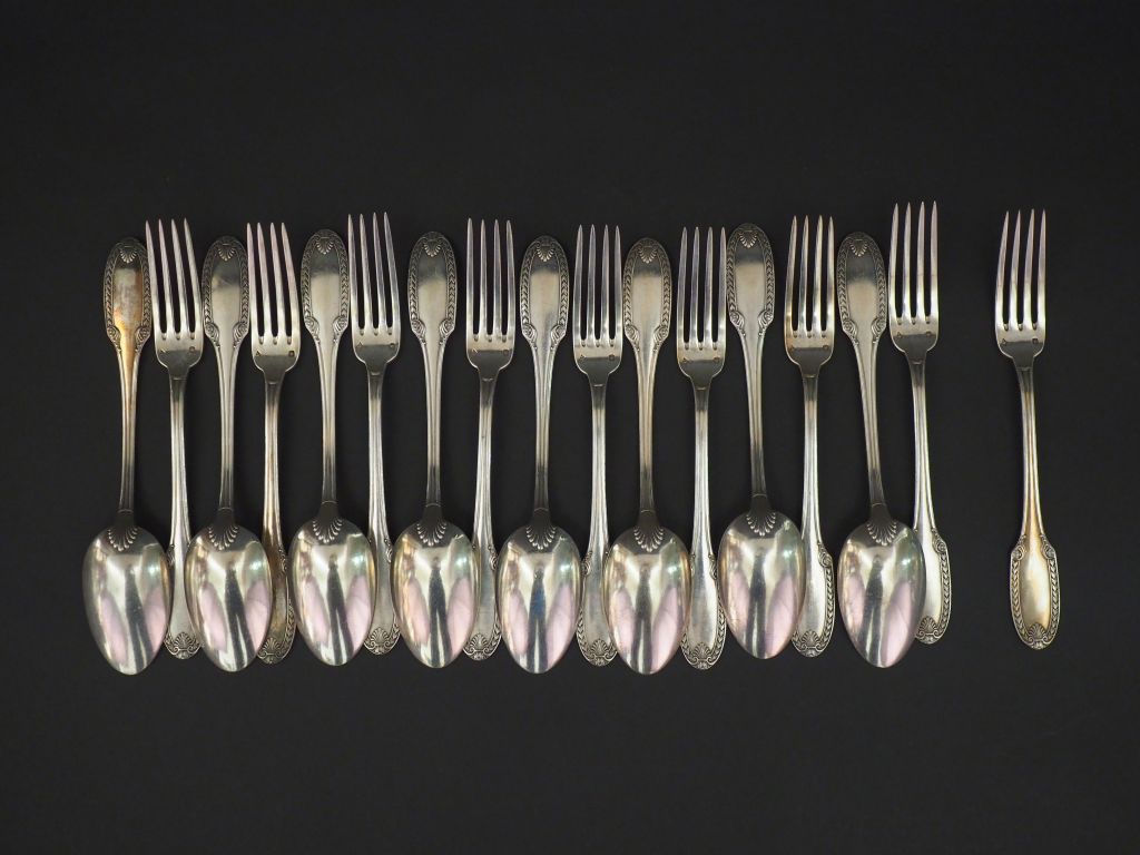 Suite de huit couverts et une fourchette à entremets de style Empire en argent, à décor de frises de feuilles de lauriers et de palmettes. M.O : P.Q Poids. 728 g