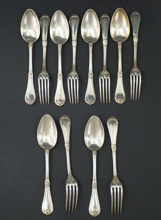 Suite de quatre couverts à entremets en argent, poinçon Minerve, à décor de masques, de fleuron et de coquilles. M.O : Veyrat On y joint quatre deux couverts à entremets en argent, poinçon Minerve, modèle légèrement dépareillé. M.O : P.Q Monogrammés. Poids. 609 g