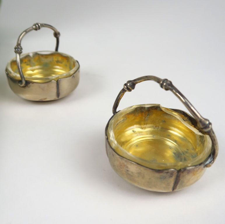 Suite de quatre salerons de style Art Nouveau en argent, poinçon Minerve, on y jont trois cuillères dans le même style. Poids sans les verrines : 117 g (une verrine accidentée, une manquante)