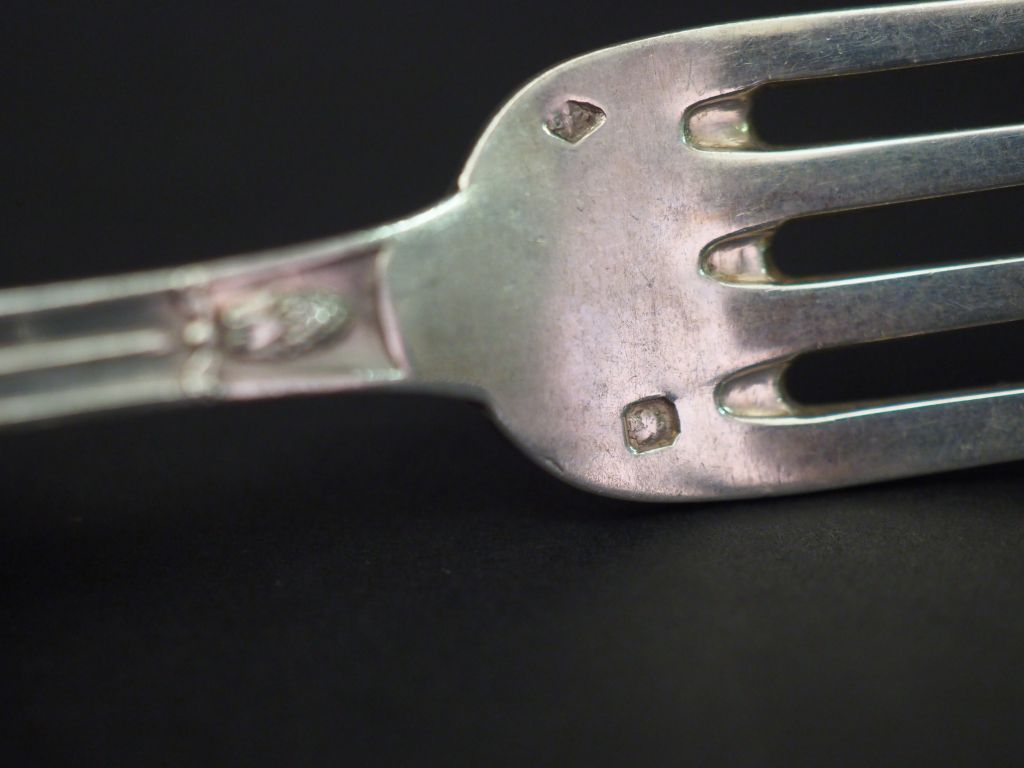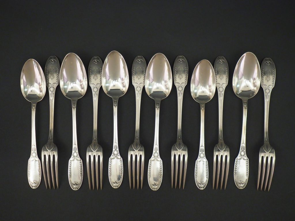 Suite de six couverts à entremets de style Empire en argent, poinçon Minerve, à décor de cygne et de guirlandes et couronnes de feuilles de lauriers. M.O : E. Puiforcat Poids. 578 g