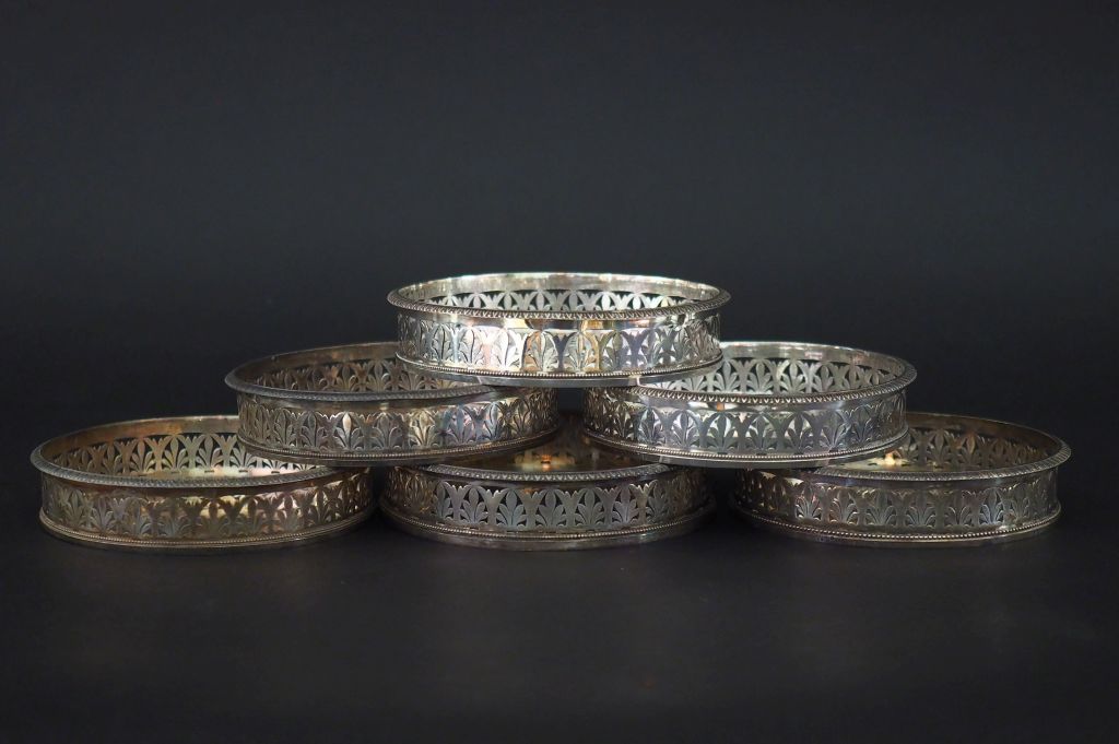 Suite de six dessous de bouteille en argent, poinçon au Coq, à décor ajouré de feuillage, d'une frise de feuilles d'eau et de rang de perles. H. 2,5 cm Diam. 12 cm Poids. 820 g