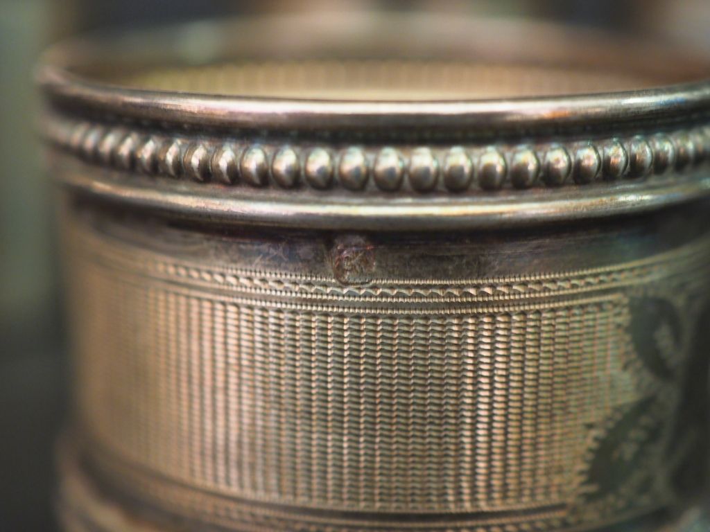 Suite de six verres à liqueur en argent, poinçon Minerve MO : Roussel Poids : 120 g Poids : 120 g on y joint deux ronds de serviette de style Louis XVI en argent, poinçon Minerve à décor de rangs de perles et de cartouche monogrammé Poids : 37 g